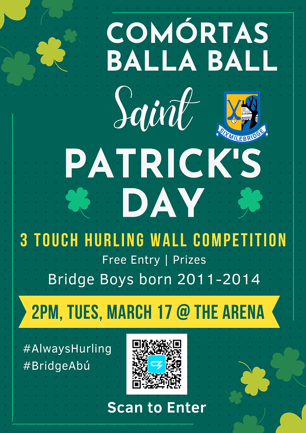 Following on from the success of the 2024 and 2025 events the good news is hurling is back on St Patricks Day in the Bridge with our Comórtas Balla Ball event happening in the arena at 2pm following the local parade. This is a 3 touch Hurling Wall competition open to all Bridge boys born in 2011, 2012, 2013 and 2014. All you need is a Hurley and Helmet and any boys interested in coming back hurling are most welcome to give this a go also. The competition groupings will be divided up based on age and ability.