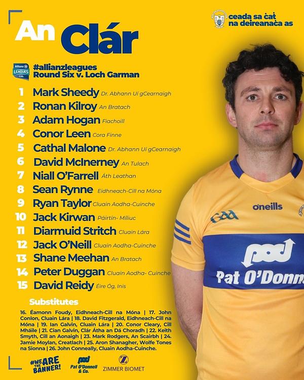 Clare welcome Wexford to @zimmerbiomet Páirc Chíosóg for Round 6 of the @Allianz NHL this Sunday . The Banner management have named their starting fifteen for the game which gets underway at 1:15pm .