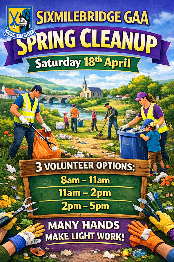 In conjunction with the Sixmilebridge Tidy Towns Spring Clean initiative which takes place on Saturday Week (April 18th) the club are looking for volunteers to help with a cleanup of our own facilities.